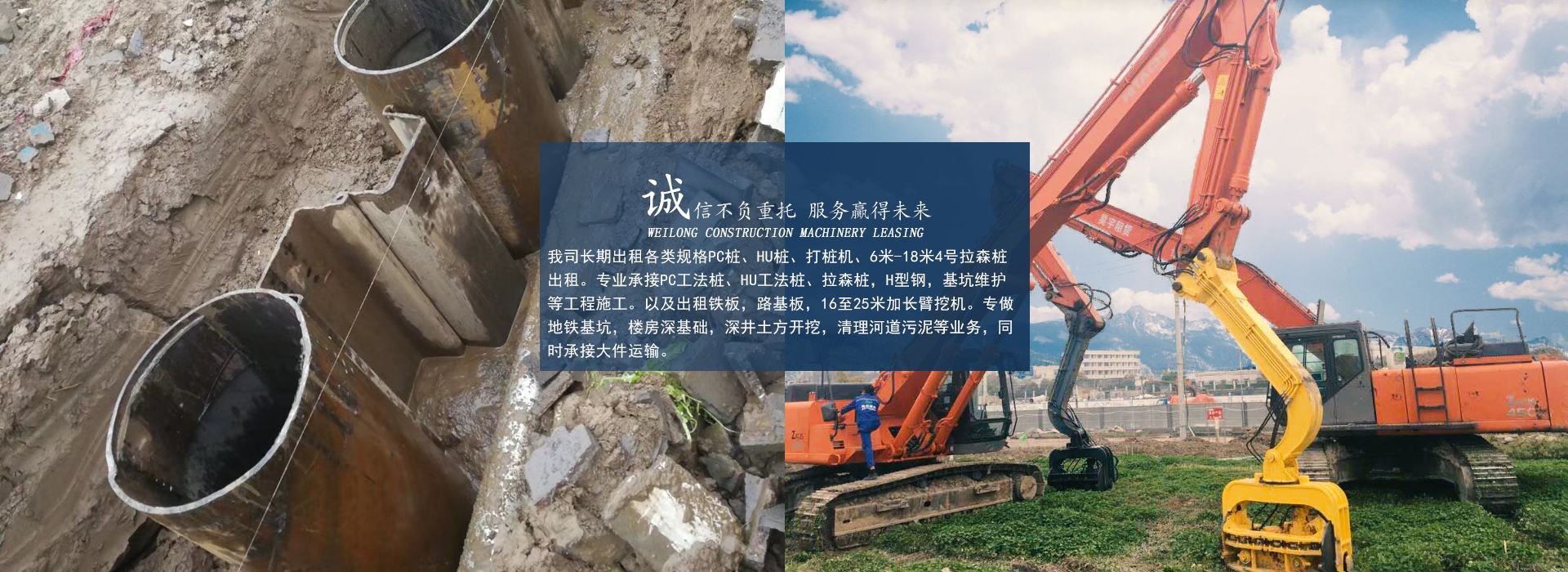 杭州偉龍機(jī)械成立于2009年,是一家專(zhuān)注拉森鋼板樁工程施工多年經(jīng)驗(yàn)的企業(yè),專(zhuān)做地鐵基坑,樓房深基礎(chǔ),深井土方開(kāi)挖,清理河道污泥等業(yè)務(wù),同時(shí)承接大件運(yùn)輸。
